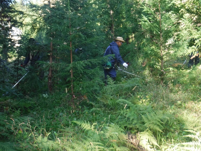 今回は参加者が 50 名近くとかなり増えて、駐車場が満杯の状況でした。希少種周辺の選抜草抜きや山桜植樹地の下地整備等を行いました。大雨が予想されましたが午前中で終了して、地元の方が用意してくれた食事を済ませて解散となりました。