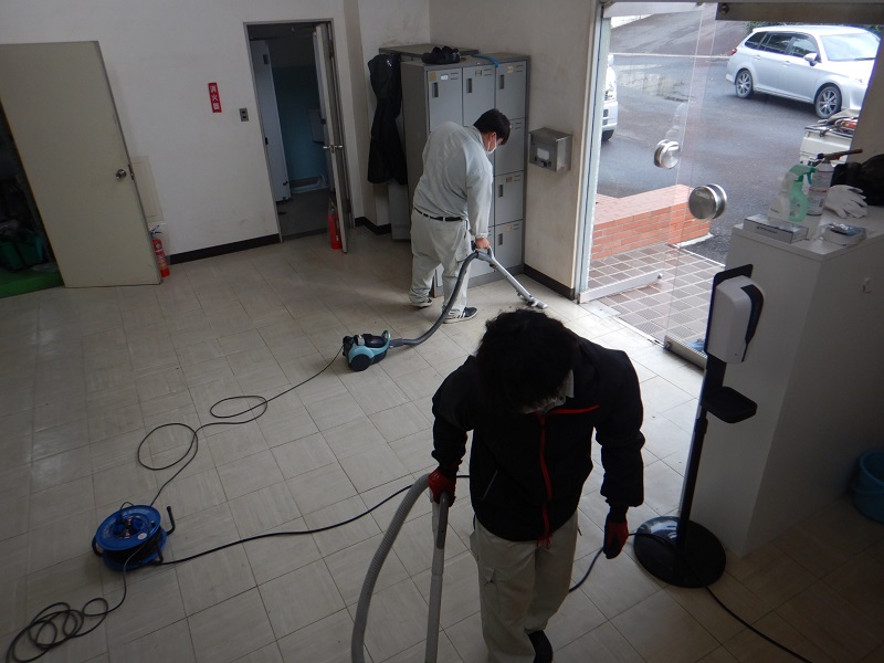 施設内にあるポンプの汚れを拭き取り、床のごみを掃除機で取り除きました。 除草作業では、周辺の草刈り・フェンスに巻き付いたツタの除去を行いました。