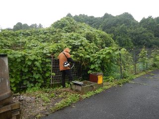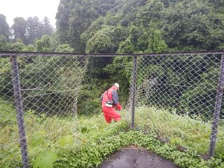 第2揚水機場(中央管理所)周辺の草刈り・フェンスに巻き付いたツタの除去を行いました。 熱中症にならないように水分補給や休憩等の対策をとりながら作業を行いました。