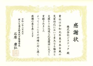 国土交通省・常陸河川国道事務所より令和元年東日本台風による緊急災害対応に対して感謝状を頂きました。