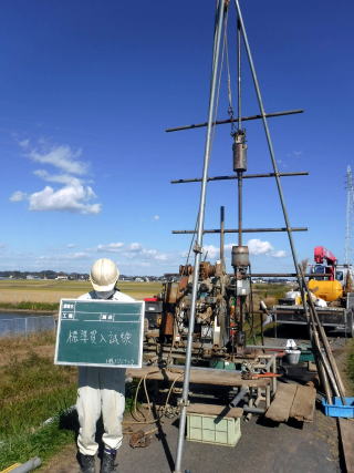 ボーリング調査やスクリューウエイト貫入試験などによって地層構成や支持層の深さを調べる