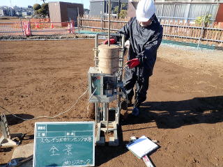 現場ではボーリング調査やスクリューウエイト貫入試験で地層や地耐力を調査し、現場から持ち帰ったサンプルは室内試験で調査します。