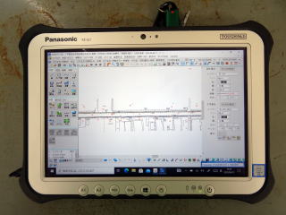 対象物の位置や形状を測定し、地形図を作る測量です。主にトータルステーションや電子平板(測量用の電子端末等)を用いて行います。